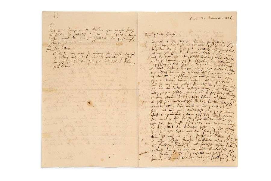L.A.S. « Robert », L. [Leipzig] 15 novembre 1836, à Therese SCHUMANN | 3 pages et demie grand in-8 remplies d’une petite écriture serrée (petites fentes réparées aux plis) | en allemand.