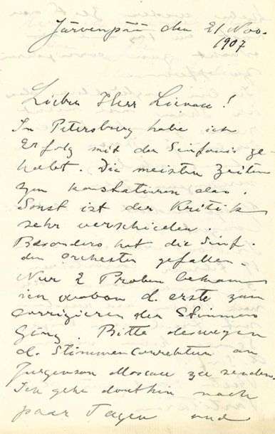 L.A.S. « Jean Sibelius », Järvenpää 21 novembre 1907, à son éditeur Robert LIENAU | 2 pages et quart in-8 (2 trous de classeur) | en allemand.
