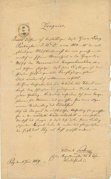 P.A.S. « Friedrich Smetana », Prague 5 juin 1869 | 1 page in-fol. avec timbre fi scal (fentes aux plis réparées, un bord légèrement eff rangé) | en allemand.