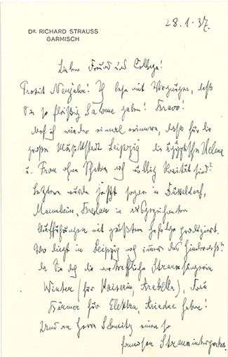 L.A.S. « Dr Richard Strauss », Garmisch 28 janvier 1937, à Paul ScHMitZ, directeur général de musique à l’Opéra de Leipzig | 1 page ¾ in-8 à son en-tête, enveloppe | en allemand.