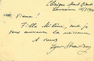 L.A.S. « Igor Strawinsky », Clinique Mont Riant, Lausanne 17 janvier 1914, à Maurice RAVEL | 1 page et demie oblong in-12 avec adresse (carte postale).