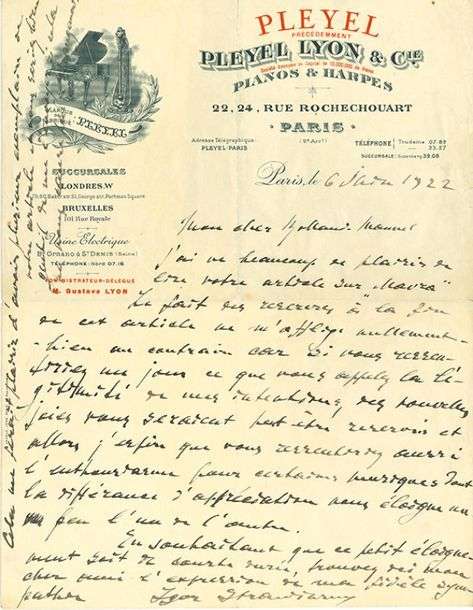 L.A.S. « Igor Strawinsky », Paris 6 juin 1922, à ROLANDMANUEL | 1 page in-4 à vignette et en-tête de Pleyel (papier légèrement froissé, petit accroc réparé)