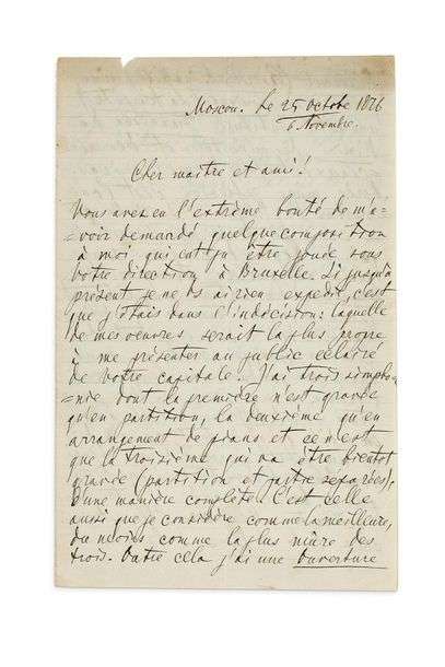 L.A.S. « P. Tschaikovsky », Moscou 25 octobre/6 novembre 1879, au chef d’orchestre Joseph DUPONT | 3 pages in-8 sur papier à ses initiales cyrilliques (infi me accroc dans la marge sup.) | en français.