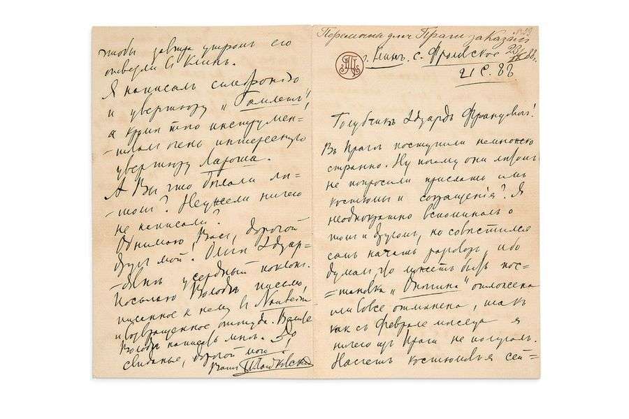 L.A.S. « P. Tchaikovsky », Kline 21 septembre [3 octobre] 1888, à Eduard NÁPRAVNIK | 4 pages in-8 à son chiff re en médaillon (en russe).