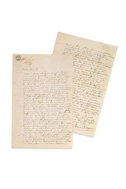 Très importante lettre à son ami emprisonné, sur les représentations en Europe de ses opéras, ses concerts à Londres, l’avancement de la composition du Ring des Nibelungen, et l’importance pour lui de la découverte de la philosophie de Schopenhauer . [Wagner s’était lié à Dresde avec le compositeur et chef d’orchestre August RÖCKEL (1814-1876), qui, avec Mikhaïl Bakounine, avait été arrêté à la suite de l’insurrection de Dresde en mai 1849 | condamné à mort, puis gracié, Röckel fut emprisonné treize ans à la prison de Waldheim près de Chemnitz. Wagner lui-même avait alors pu s’enfuir en Suisse, d’où il écrivit de nombreuses et importantes lettres à Röckel.]