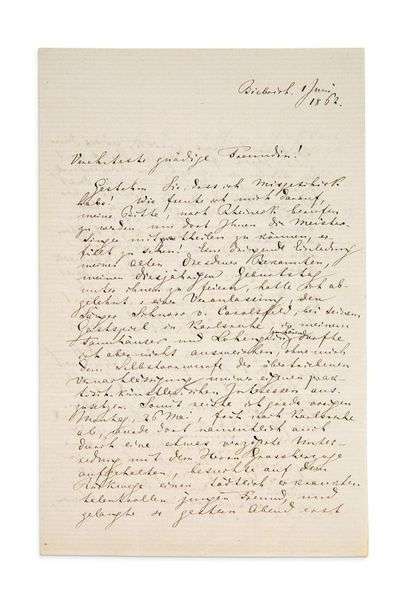 L.A.S. « Richard Wagner », Biebrich 1er juin 1862, [à la comtesse Mélanie de POURTALÈS] | 3 pages in-8 (pli médian légèrement fendu) | en allemand. 2