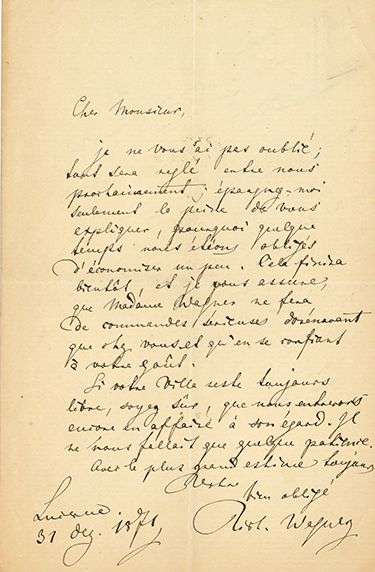 L.A.S. « Rich. Wagner », Lucerne 31 décembre 1871 | 1 page in-8 (traces de montage sur la p. 4) | en français.