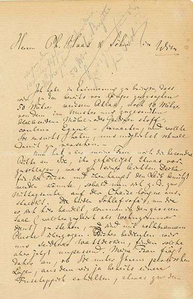 Lettre aux fameux tapissiers viennois, quelques jours après l’installation des Wagner dans leur nouvelle maison « Wahnfried ». Il rappelle qu’outre les 50 mètres d’atlas blanc (« weissen Atlas »), promis depuis longtemps, ils attendent encore 10 mètres d’étoffe mi-soyeuse pour meubles ou rideaux (« Halbseiden- Möbel- oder Gardinen Stoff »), de la couleur dont ils ont reçu un échantillon. Mais maintenant sa femme a une requête spéciale : qu’ils recommandent ce qui pourrait être employé pour une couverture légère des pieds et du corps en général, lorsqu’on s’allonge sur la chaise longue, par exemple, pour la sieste (« was zu einer leichten Decke für die Fusse und überhaupt den Leib benützt werden könnte, sobald man sich z. B. zur Mittagsaube auf der Chaise-longue ausstreikt ». Les deux canapés-lits (« Schalfsofas ») dont il s’agit seront placés dans le grand hall (qui sert aussi de salon), et sont recouverts de peluche rougebrun. Jusqu’à présent ils ont utilisé des couvertures en soie, mais ils les trouvent maintenant inappropriées. Sa femme souhaite donc savoir s’ils ont dans leur magasin persan, d’où ils ont déjà reçu un tapis, quelque chose qui conviendrait, un châle ou quelque chose de semblable. Il leur en faudrait deux, pareils de style sinon de motif et couleur. Il compte sur leur amabilité et se recommande dans cette affaire à l’affection de son vieil ami Nader…