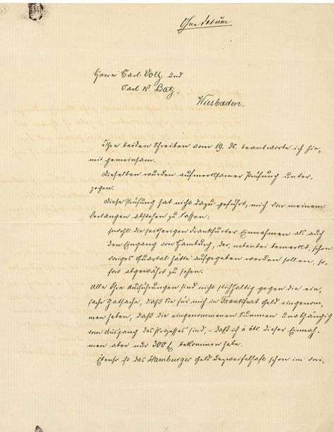 Wagner réclame à Batz et Voltz le règlement des recettes de Francfort et de Hambourg. Quant à leurs prétentions pour Dresde et Vienne, il les prie d’en dresser la liste, de les justifier avec les lettres échangées, en exposant quand et avec qui ils eu des contacts pour défendre les intérêts de Wagner. Devenu fort méfiant, il se voit d’autant plus obligé de demander des preuves que lors de son dernier voyage à Vienne, en novembre 1874, on a là-bas pratiquement nié avoir été en relation avec ses agents à son sujet ! Et il n’a pas encore le moindre témoignage de Dresde, comme quoi Batz et Voltz auraient fait des démarches dans son intérêt, et bien moins encore qu’elles auraient eu un quelconque succès. Ils peuvent laisser tomber tout cela, parce qu’à Dresde, ils n’obtiendront rien du tout, ni l’un, ni l’autre... Quant au changement intervenu dans leurs relations, ils doivent en chercher la cause exclusivement chez eux-mêmes... Wagner reproche à ses correspondants de n’être pas même venus signer le nouveau contrat qu’ils avaient établi ensemble, et d’avoir le triste courage de lui soumettre une contre-proposition qui est pratiquement une attaque contre son honneur et qui devrait le faire tomber de façon révoltante sous leur dépendance. A la vue de cette évolution des choses, et, partant, de la connaissance ainsi acquise de ses relations avec eux, il ne peut plus y avoir entre eux qu’une relation d’affaires strictement, d’où il souhaite que toutes les élucubrations quant à leur dévouement, par exemple la préférence qui lui serait accordée par rapport à d’autres compositeurs, soient bannies, parce qu’elles lui paraissent très absurdes... Aussi bien toute tentative d’imputer à d’autres la responsabilité de cette nouvelle situation