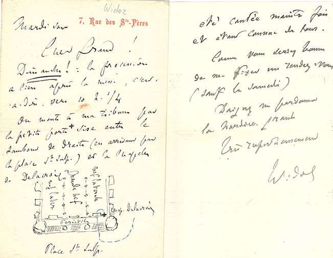 Mardi soir, à Massenet, « Cher Grand ! ». Instructions pour monter à sa tribune à Saint-Sulpice, par une petite porte attenante à la « chapelle de Delacroix », avec plan dessiné | allusion à la générale Massenet qu’il rencontra lors de l’inauguration de l’orgue de l’église Saint-Ouen à Rouen [en 1890]. 15 novembre 1910. La charmante lettre de Juliette Massenet est « si délicieusement bonne ! »… 27 septembre 1915. Il va faire un discours à l’Académie des beaux-arts sur MASSENET : « Je voudrais des détails biographiques et surtout parler de lui intime, sa vie artistique ayant été contée maintes fois et étant connue de tous »… 29 septembre. Il viendra l’interviewer vendredi sur son père, « dont je voudrais faire un portrait très fidèle, très sympathique, très affectueusement dessiné, et nul mieux que vous, ne peut me guider ! »… 13 octobre. « Waltner doit graver en tête de mon discours le portrait de votre illustre père. Avez-vous quelques photographies à lui confier quelques jours ? »… 4 juin. « J’accepte avec une vive gratitude la si aimable invitation pour le 15 ! »…