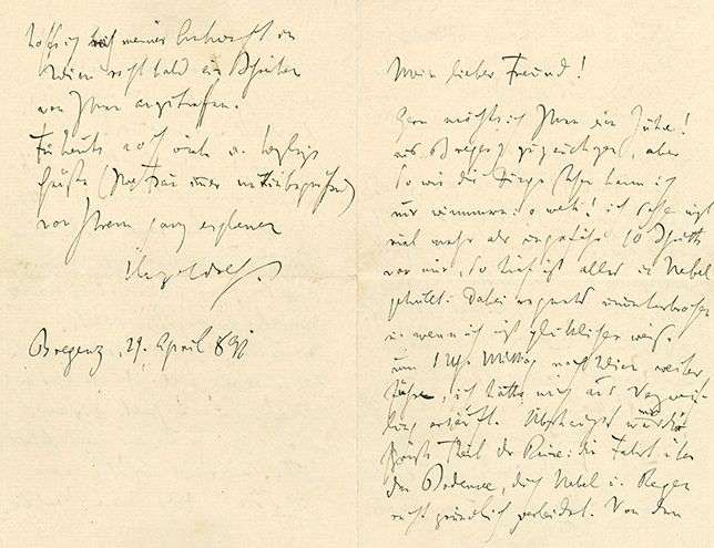 Il a atteint Bregenz depuis Friedrichshafen après un beau voyage en bateau sur le lac de Constance (Bodensee). Il admire les sommets enneigés du Tyrol et de la Suisse. Avant, il était chez des amis à Tübingen où une soirée a été donnée en son honneur, et il décrit l’enthousiasme que ses Lieder suscitent auprès du public [sans doute l’Italienisches Liederbuch qu’il était en train de composer], et où il a remporté un vrai triomphe. Tout le monde, hommes et femmes étaient comme fous. Wolf était de la meilleure humeur, il chantait et jouait comme s’il avait le diable au corps. Il rentre à Vienne le lendemain…