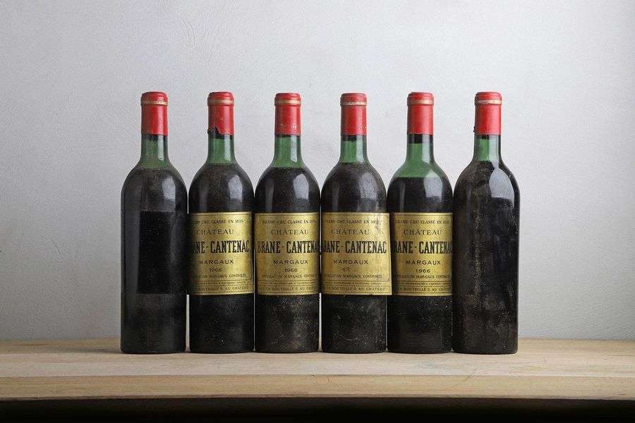 6 B CHÂTEAU BRANE CANTENAC (2 B.G.-| 1 T.L.B| 2 H.E.+ et 1 M.E.-| 5 e.l.s. dont 2 décollées| 1 avec le millésime illisible) - 1966 - GCC2 Margaux