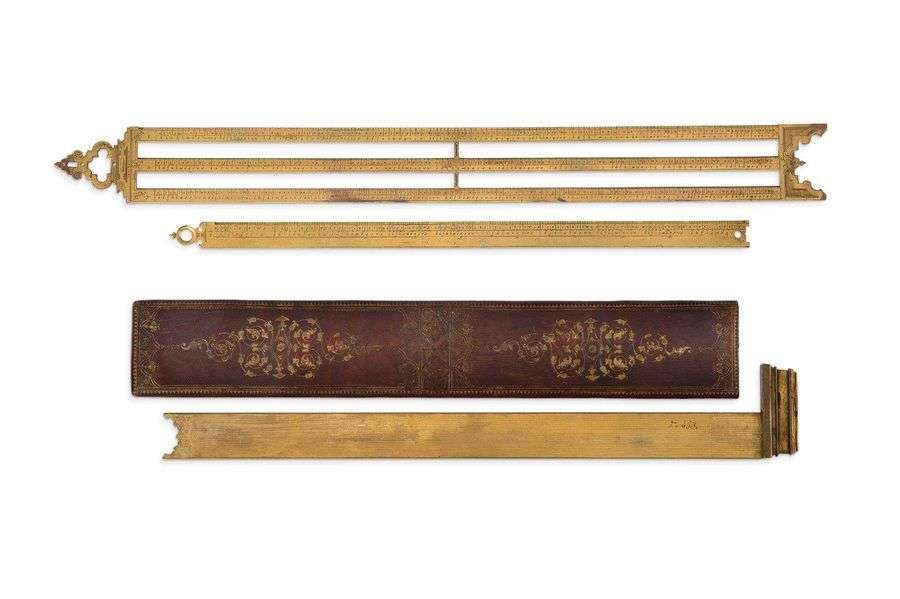 Remarquable suite de trois instruments de mesure en laiton doré dont une équerre dans un superbe étui en maroquin rouge doré aux petits fers. La grande échelle porte la signature de « Erasme Habermelius fec » Les deux autres instruments sont probablement d'Habermel XVIIe siècle