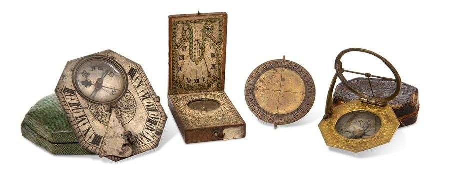 Suite de trois cadrans solaires un cadran type Butterfield en métal argenté, un cadran solaire diptyque de « colportage » en bois et papier, et un cadran solaire équatorial d'Augsbourg en laiton doré dans son écrin de cuir, portant une signature apocryphe: Cavi Com: (?). Biagio Pignatta Fece 1779 Siena.