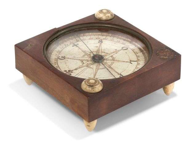 ~Charmante boussole carrée en acajou à pieds et pastilles d'ivoire avec une rose manuscrite. XVIIIe siècle