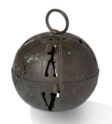 Chaufferette à mains en laiton gravé et ajouré de forme sphérique composée de deux moitiés s'encastrant l'une dans l'autre et fermées par un crochet| décor géométrique| anneau. XVIIe siècle