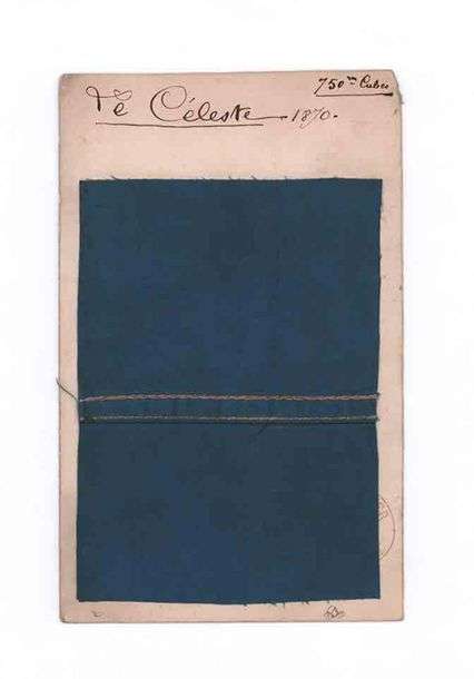 Fragment de toile du ballon LE CÉLESTE fixé sur carton avec cachet rouge en forme de ballon CH. CHAUVOUTIER Constructeur Aéronaute à Paris, R. Louis le Grand.