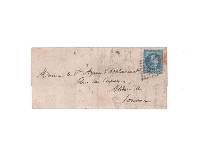 20c lauré obl. losange ambulant CP 2° sur Lm du 2 octobre 1870 pour Abbeville. Au verso griffe bleue ARMÉE DE PARIS / GÉNIE MILITAIRE et càd PARIS à CALAIS, CALAIS à PARIS et ABBEVILLE 8 OCT. 70. PLI CONFIÉ AUX AÉRONAUTES DE L'ARMAND BARBES. TB.