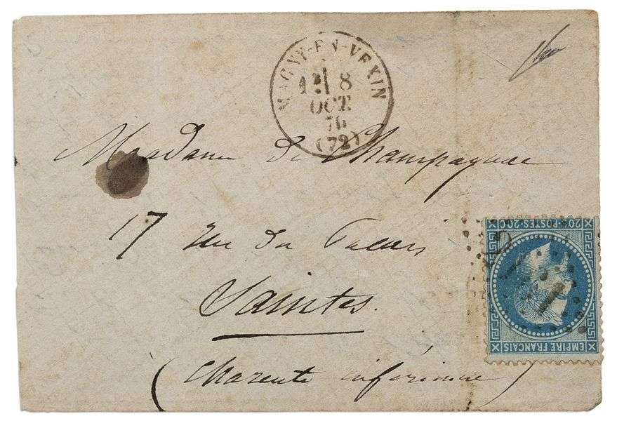 20c lauré obl. GC 2161 càd MAGNY-EN-VEXIN 8 OCT. 70 sur enveloppe pour Saintes. Au verso grand cachet rouge des Aérostiers « REPUBLIQUE FRANÇAISE - Nadar Dartois Duruof» et càd d'arrivée (illisible). PLI CONFIÉ AUX AÉRONAUTES DE L'ARMAND BARBES. Rare et TB