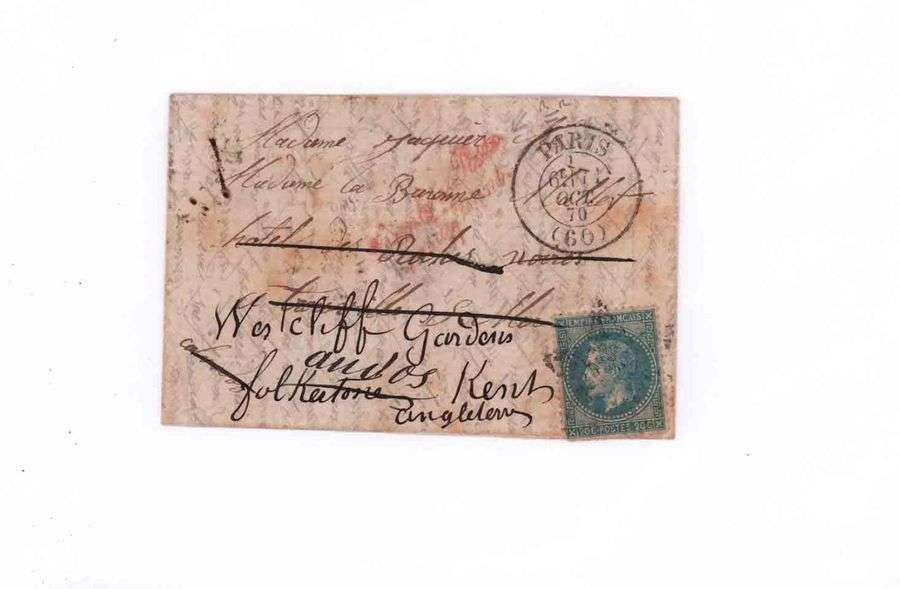 PARIS (60) sur Lm du 11 octobre 1870 pour TROUVILLE- SUR-MER et réexpédiée à FOLKESTONE. Au recto griffe rouge en italique TIMBREPOSTE INSUFFISANT. Au verso càd d'arrivée TROUVILLE 18 OCT. 70 et