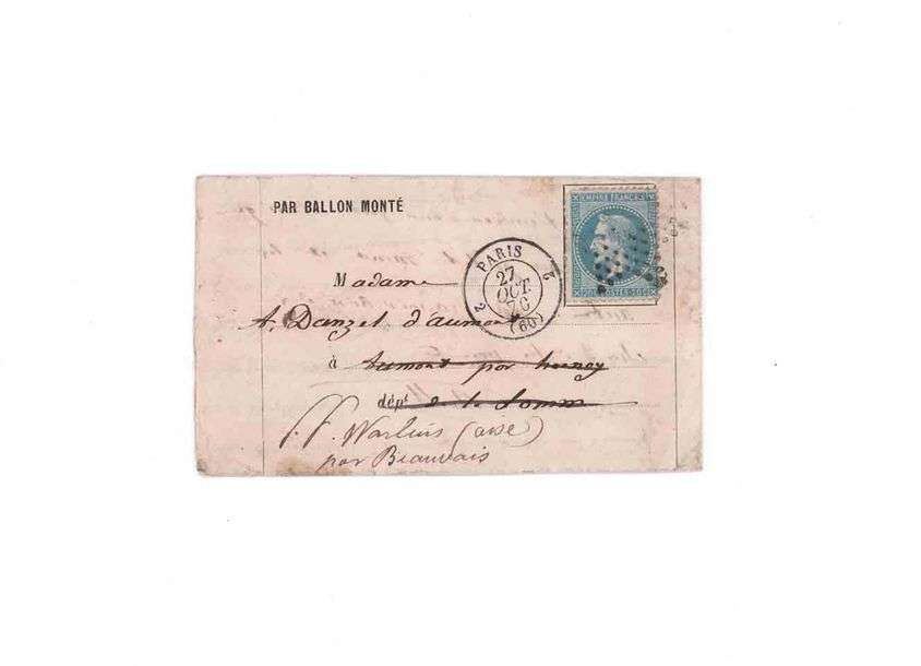 20c lauré obl. étoile pleine rare cachet de route 2 PARIS 2 (60) sur formule PAR BALLON MONTÉ. Lm du 26 octobre 1870 pour la Somme et réexpédié dans l'Oise. Au verso càd d'arrivée BEAUVAIS 4 NOV. 70.