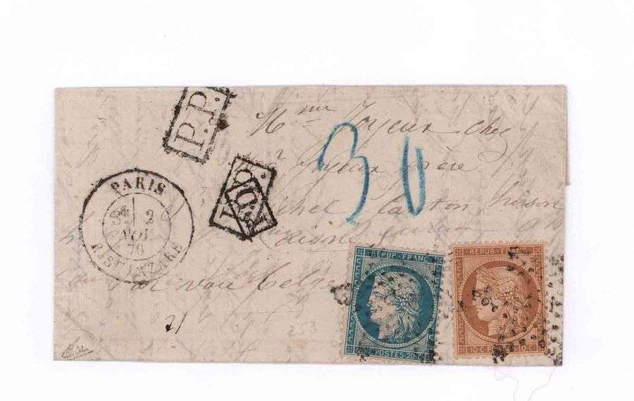 10c et 20c Siège obl. étoile 2 PARIS R. St. Lazare 2 NOV.70 pour HIRSON en zone occupée avec mention manuscrite Par voie belge, avec 2 griffes PP encadrées, et griffe