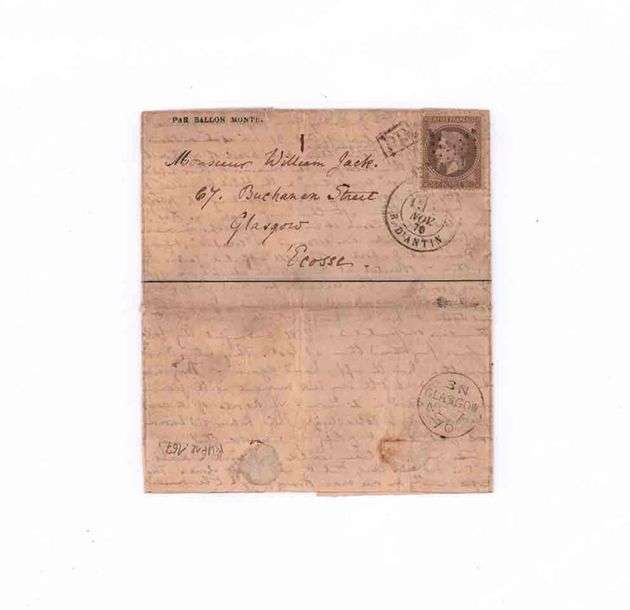 30 c lauré obl. étoile 8 PARIS R. d'Antin sur Lm du 1er novembre 1870 pour GLASGOW. Au verso càd GLASGOW NO 7 1870.