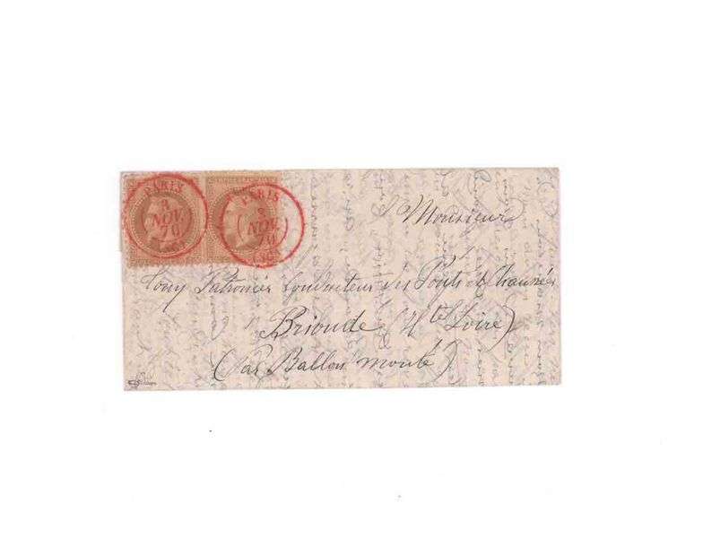 10c lauré en paire obl. PARIS (SC) rouge sur Lm datée Fort d'Aubervilliers 1er novembre 1870, pour Brioude. Au verso càd d'arrivée 7 NOV. 70. LE FERDINAND FLOCON. SUP.