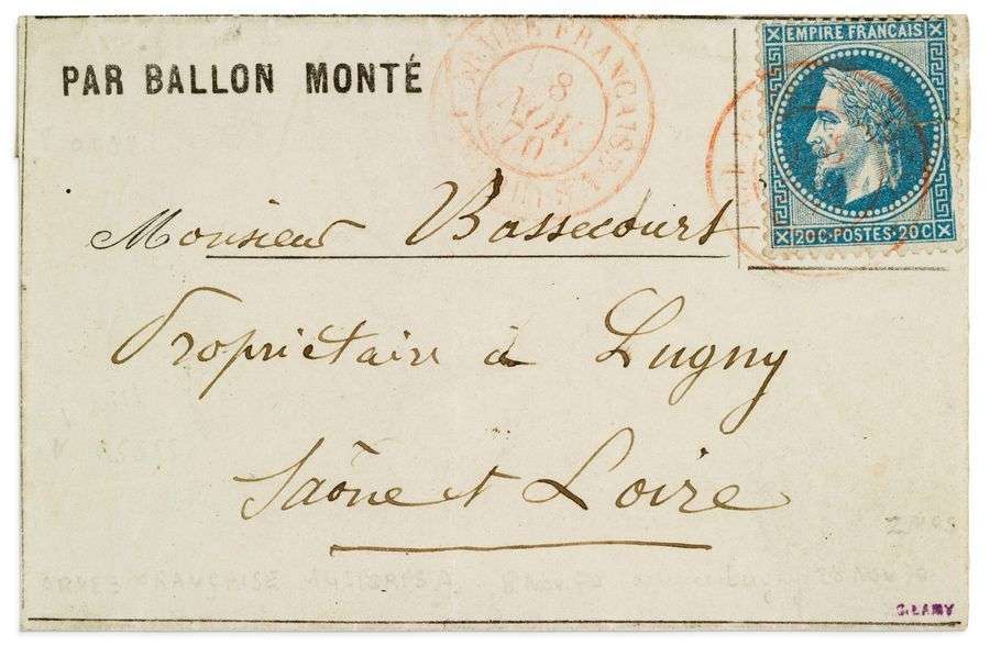 Au verso càd d'arrivée Lugny 28 NOV. 70. LE DAGUERRE provenant du sac de courrier jeté au-dessus de Ferrières.