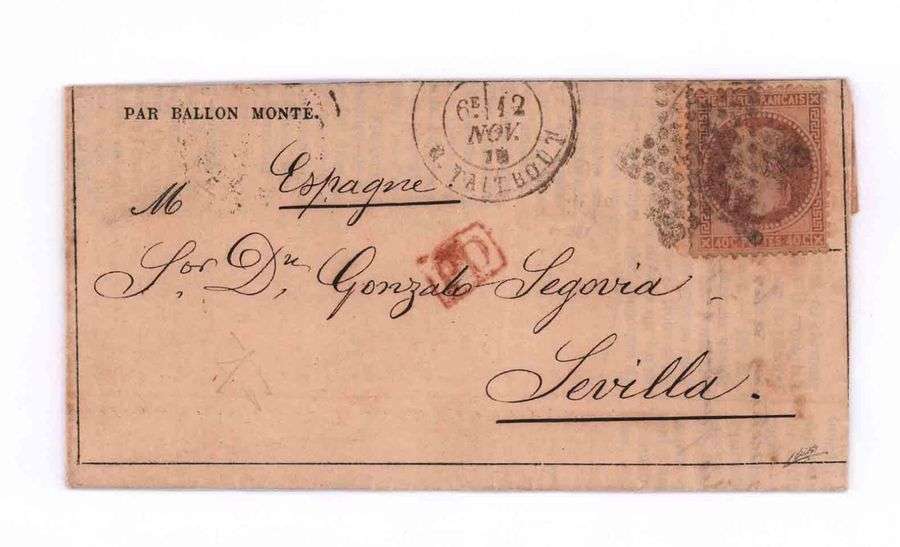 40c lauré obl. étoile 22 PARIS Rue Taitbout sur GA n°7 avec son supplément pour SEVILLE. Au verso càd ambulant CALAIS à PARIS 25 NOV.70, BORDEAUX à IRUN 28