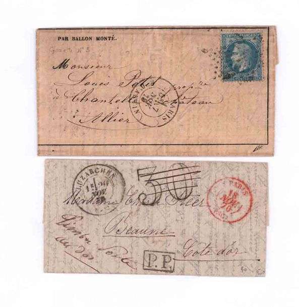 20c lauré mis au dos et arraché à l'ouverture avec trace d'oblitération PARIS (SC) rouge. Au recto càd rouge PARIS (SC) taxe 30 doubles traits rayés et P.P. encadré avec càd d'atterrissage LUZARCHES 20 NOV. 70. Lm du 14 novembre 1870 pour Beaune | Au verso càd d'arrivée 28 NOV. 70.