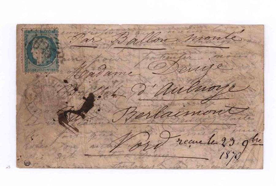 20c Siège obl. GC 1625 rare càd PARIS La Gare d'Ivry (faible) sur Lm du 19 novembre 1870 pour Berlaimont (Nord). Au verso càd d'arrivée PARIS à ERQUELINES 23 NOV.70. L'ARCHIMÈDE. B.