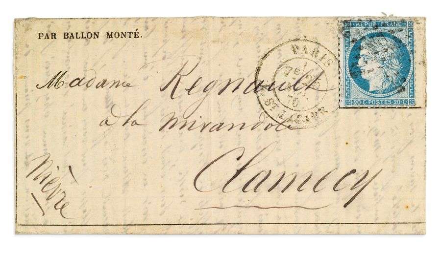 20c Siège (dentelure diminuée) obl. étoile 2 Paris R. St Lazare sur GA n°10 du 23/11/1870 pour Clamecy.
