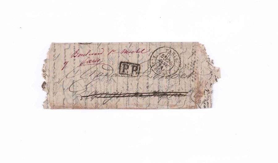71 sur Lm du 26 janvier 1871 pour Langrune-sur-Mer et réexpédiée à Paris avec P.P. encadré noir. Au verso rare cachet de transit CAEN 13 AVRIL 71 et d'arrivée à LUC-SUR-MER 14 AVRIL 71. PLI TRANSPORTÉ PAR LE RICHARD WALLACE, perdu en mer au large de la Baie d'Arcachon. B/TB.