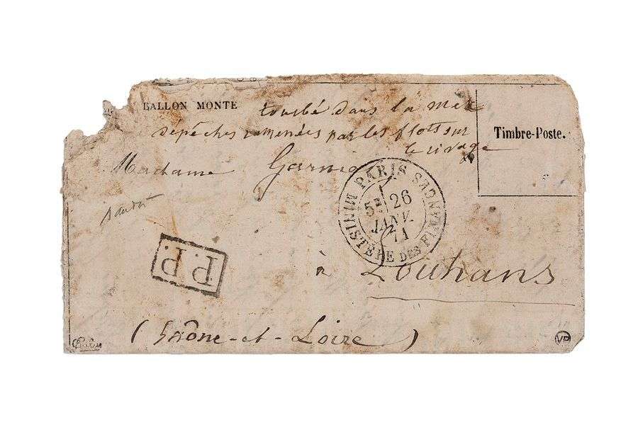 Timbre tombé par immersion sur GA n°32 du 26 janvier 1871. Lm du 26 janvier 1871 pour Louhans. Griffe PP encadrée noir pour justifier l'absence de timbre. Mention manuscrite « Tombé dans la mer dépêches ramenées par les flots sur le rivage ». Au verso cachet de repêchage La Rochelle 12 FEVR. 71 et d'arrivée à Louhans 16 FEV. 71. LE RICHARD WALLACE perdu en mer au large de la baie d'Arcachon. Etat moyen mais rare