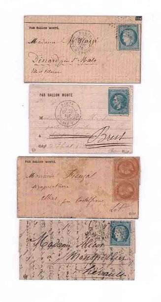 ENSEMBLE DE QUATRE PLIS par Ballons montés dont deux Gazettes des Absents n° 11 et n° 12, une avec cachet PARIS (SC) rouge. TB.