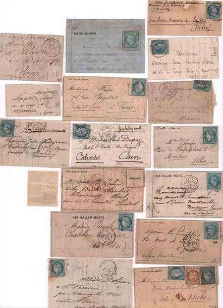 ENSEMBLE DE 14 LETTRES PAR BALLONS MONTÉS dont une Gazette des Absents n°21 obl. càd ARMÉE FRANÇAISE C sur les timbres | une pour l'Italie | une très petite lettre avec la griffe MARINS DE LORIENT | une lettre pour Strasbourg avec taxe prussienne | une Gazette des Absents n° 10 par LA VILLE D'ORLÉANS pour LONDRES et un pli confié.