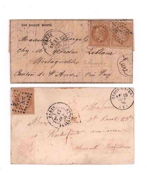 ENSEMBLE DE 2 BALLONS MONTÉS dont une carte, timbre changé, avec càd d'atterrissage de CRECY-SUR-SERRE par LE JEAN BART N°2 et une Gazette des Absents n°17 par LE LAVOISIER. Joint, une enveloppe avec Garde mobile de Saint-Denis pour PASSY. B/TB.