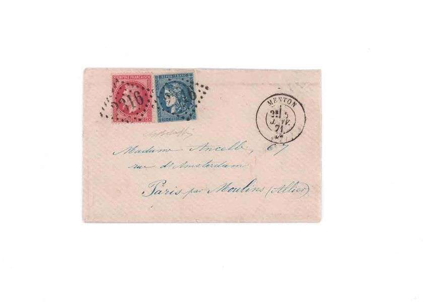 20c Bordeaux type II et 80c lauré obL GC 2316 càd MENTON (87) 5 JANV.71 sur enveloppe avec Lm du 5 janvier 1871. Affranchissement complet. Sans arrivée. SUP.