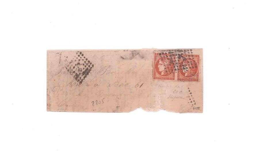 40c Bordeaux en paire (un timbre léger déf.) obl. losange ambulant BP sur Lm datée de DENAIN du 2 janvier 1871. Au verso càd ambulant BREST à PARIS 2 JANV. 71. Manque un timbre de 20c. Sans arrivée. B/TB