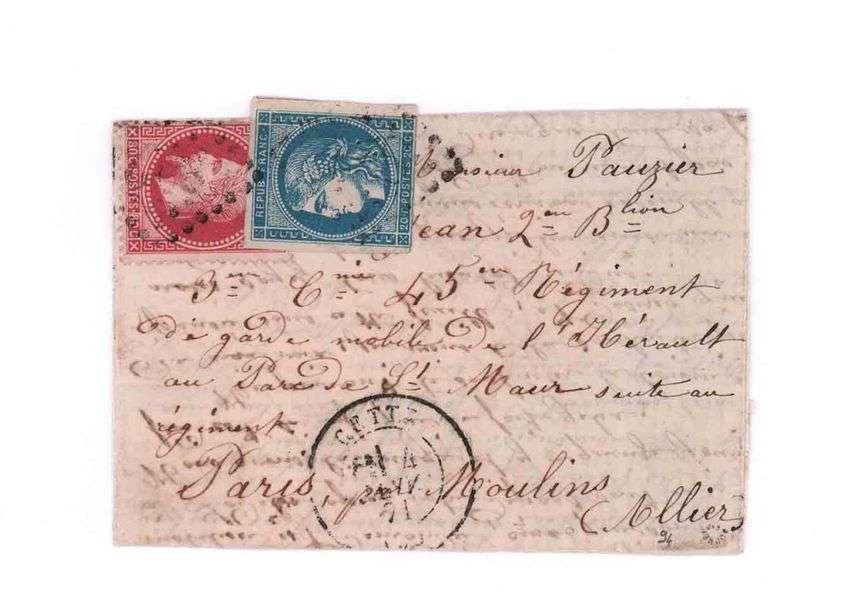 20c Bordeaux type II et 80c lauré obl. GC 822 càd CETTE (33) 4 JANV.71, Lm de Usclas 2 janvier 1871. Sans arrivée.