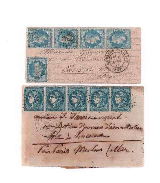 20c lauré bande de quatre et un exemplaire (probablement remis) obl. GC 2565 càd MOULINS-S-ALLIER (3) 6 JANV. 71 sur Lm datée de BRUXELLES 30 décembre 1870 pour Paris.