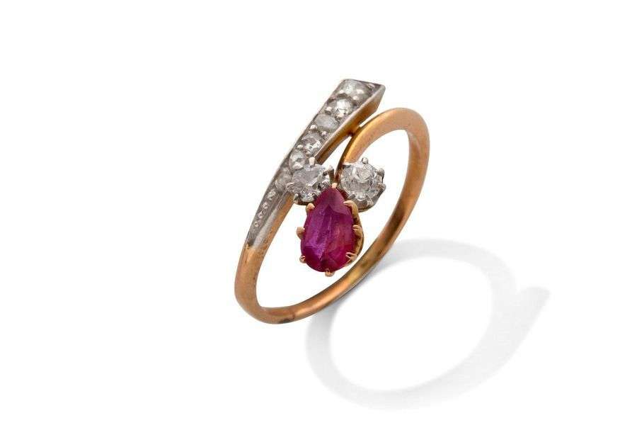 diamants de taille ancienne, de taille rose, rubis de forme poire, or rose 18K (750), platine (850)