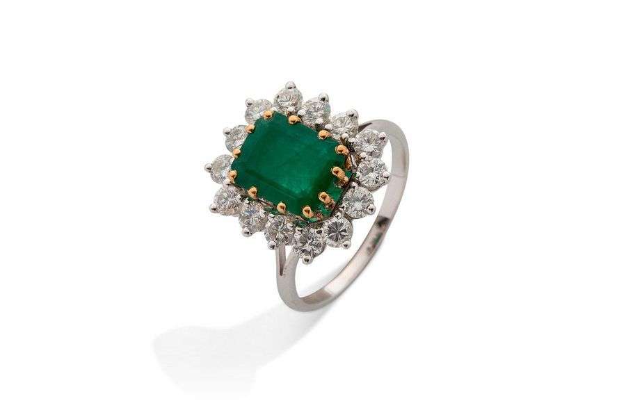 Èmeraude ‡ pans coupÈs, entourage de diamants, or gris et jaune 18K (750)