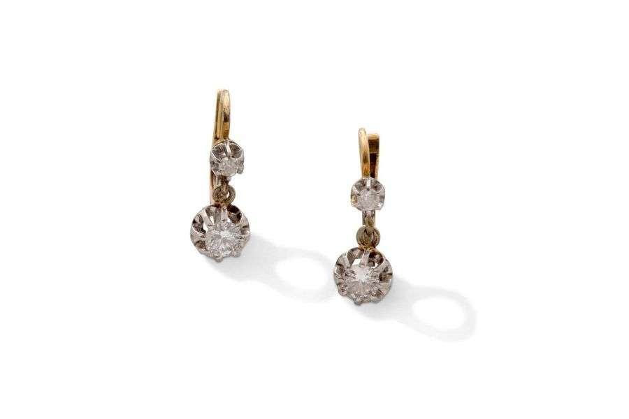 paire de motifs d'oreilles sertie de diamants de taille ancienne, or jaune et gris 18K (750), platine (850).
