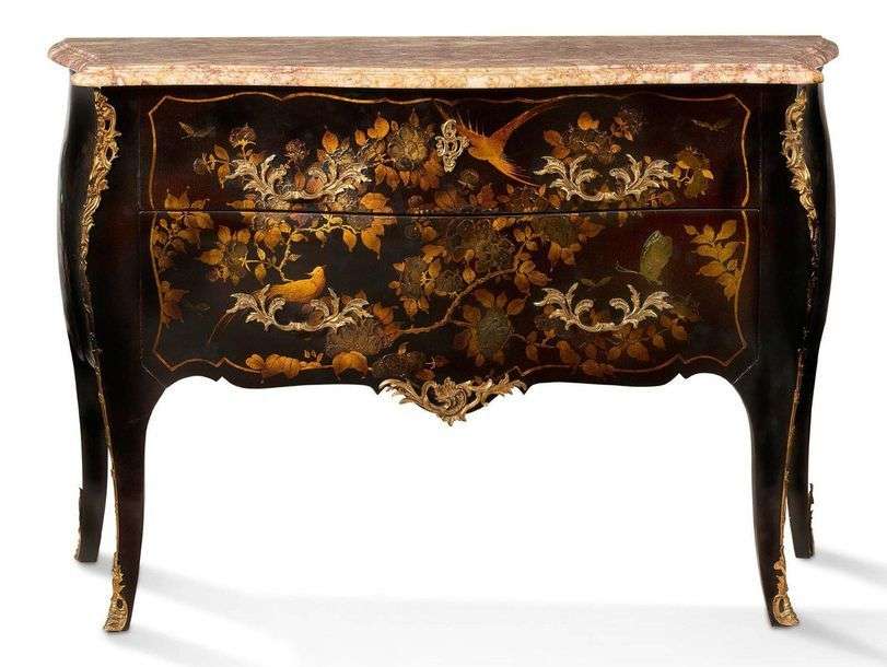 COMMODE en vernis Martin, façade légèrement galbée ouvrant à deux tiroirs