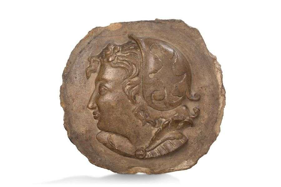 PAIRE DE MÉDAILLONS en terre cuite représentant en fort relief les têtes de profil à l'antique d'un homme et d'une femme. Homme barbu et moustachu coiffé d'un casque à visière, femme à la chevelure retenue par un bonnet à décor de rinceaux feuillagés. Vers 1520/30