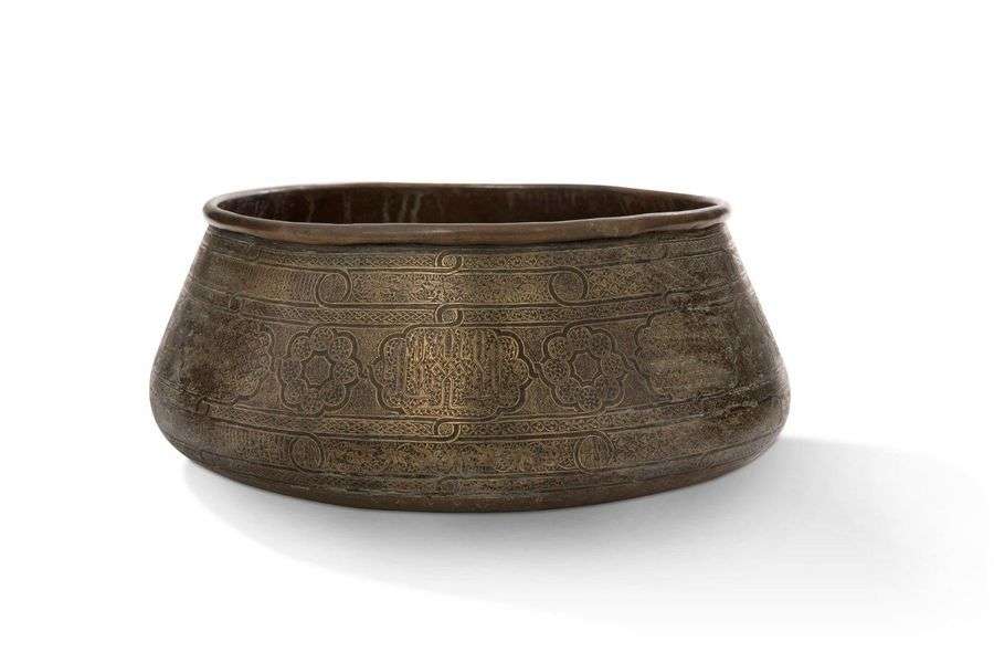 GRAND BASSIN TÂS à panse renflée, lèvre ourlée, en alliage cuivreux à décor gravé et rehaussé de pâte noire. Plusieurs registres de frises tressées, d'entrelacs, de lotus ou calligraphiques interrompues par des médaillons. Au centre, bandeau principal alternant cartouches et médaillons polylobés, les premiers calligraphiés ou à décor géométrique, les seconds à décor de rinceaux enroulés. Les inscriptions en thuluth ou coufique tressé donnent des titres honorifiques en arabe tels que « Le roi du monde » ou «al-sultan al-zahir ».Iran, XVIIIe siècle