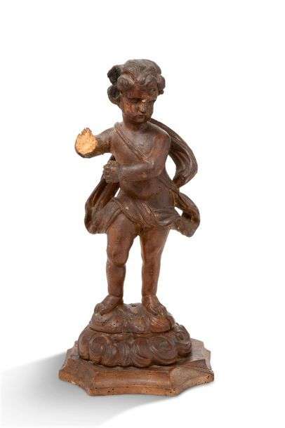 Putto probablement céréforaire en bois sculpté et patiné reposant sur une