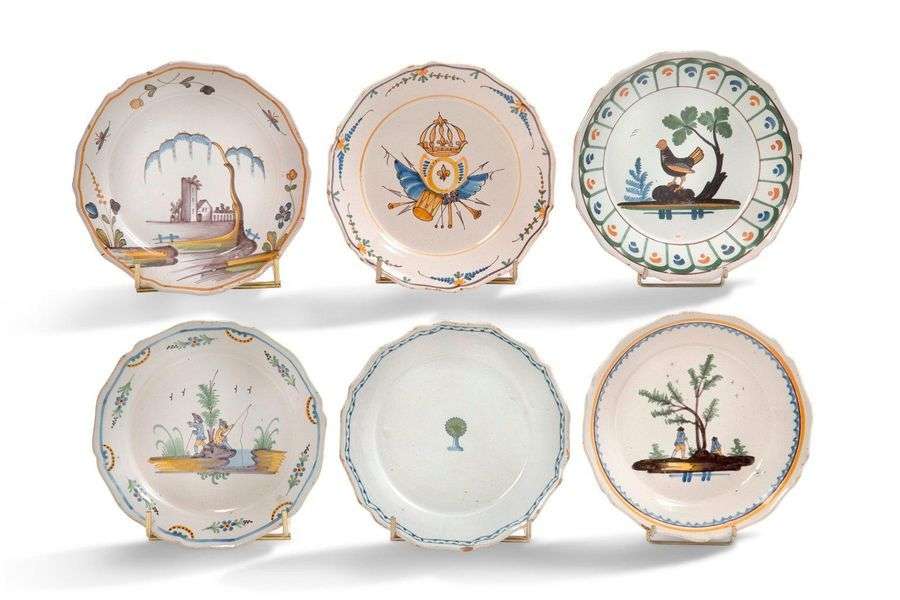 Six assiettes à bord contourné en faïence émaillée polychrome, l'une à décor révolutionnaire de trophée d'instruments de musique et drapeaux surmontés de la couronne royale. Les autres, à motif de paysages animés de pêcheurs, d'un coq et d'un arbre.